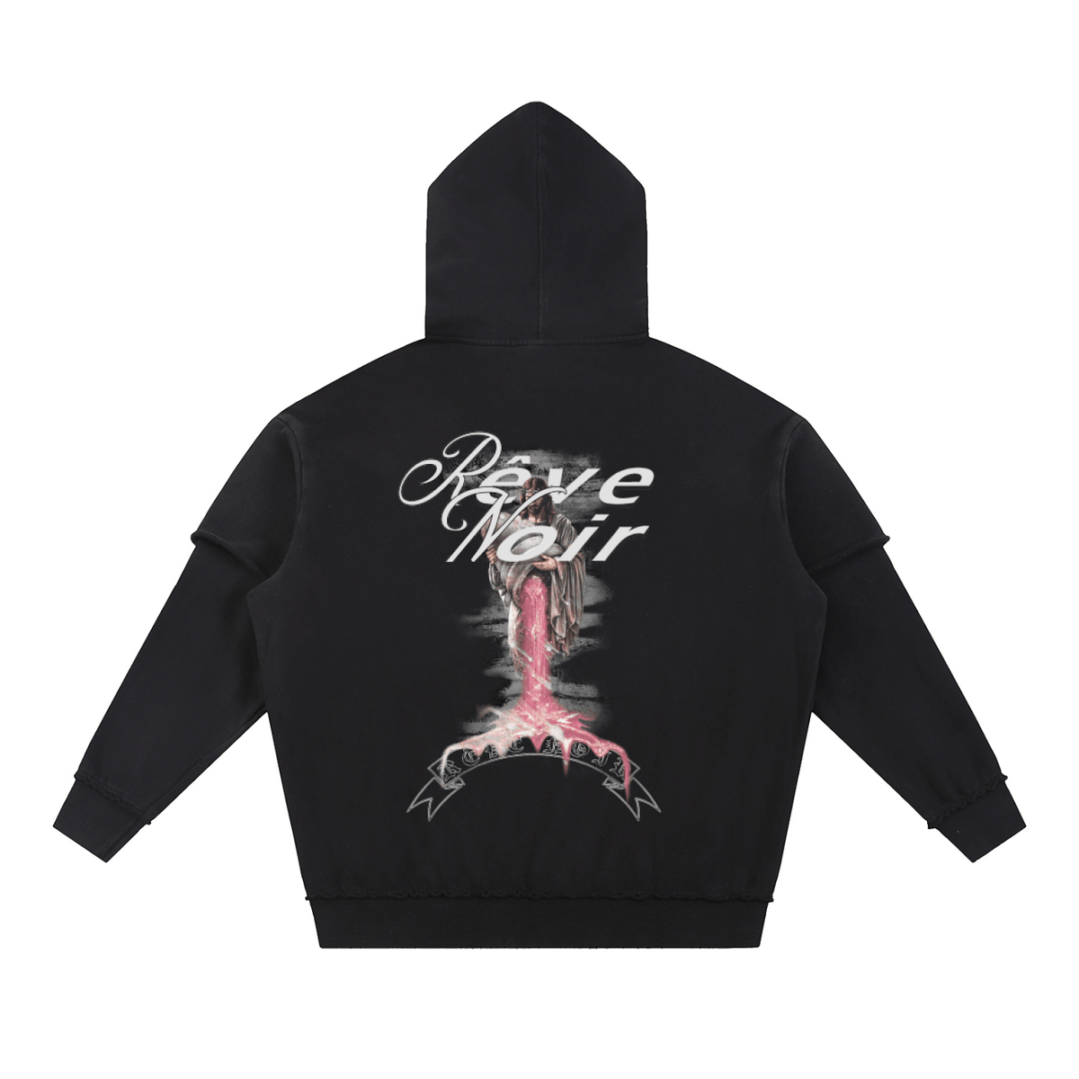 Rêve Noir™ introduces the “Divine Pour” Raw Edge Hoodie, a unisex oversized layer that leans into contrast and iconography. On the back, a Jesus figure pouring purple liquid from a styrofoam cup turns the hoodie into a moving image—part sacred, part street poster—sitting right in the middle of the Rêve Noir™ universe.